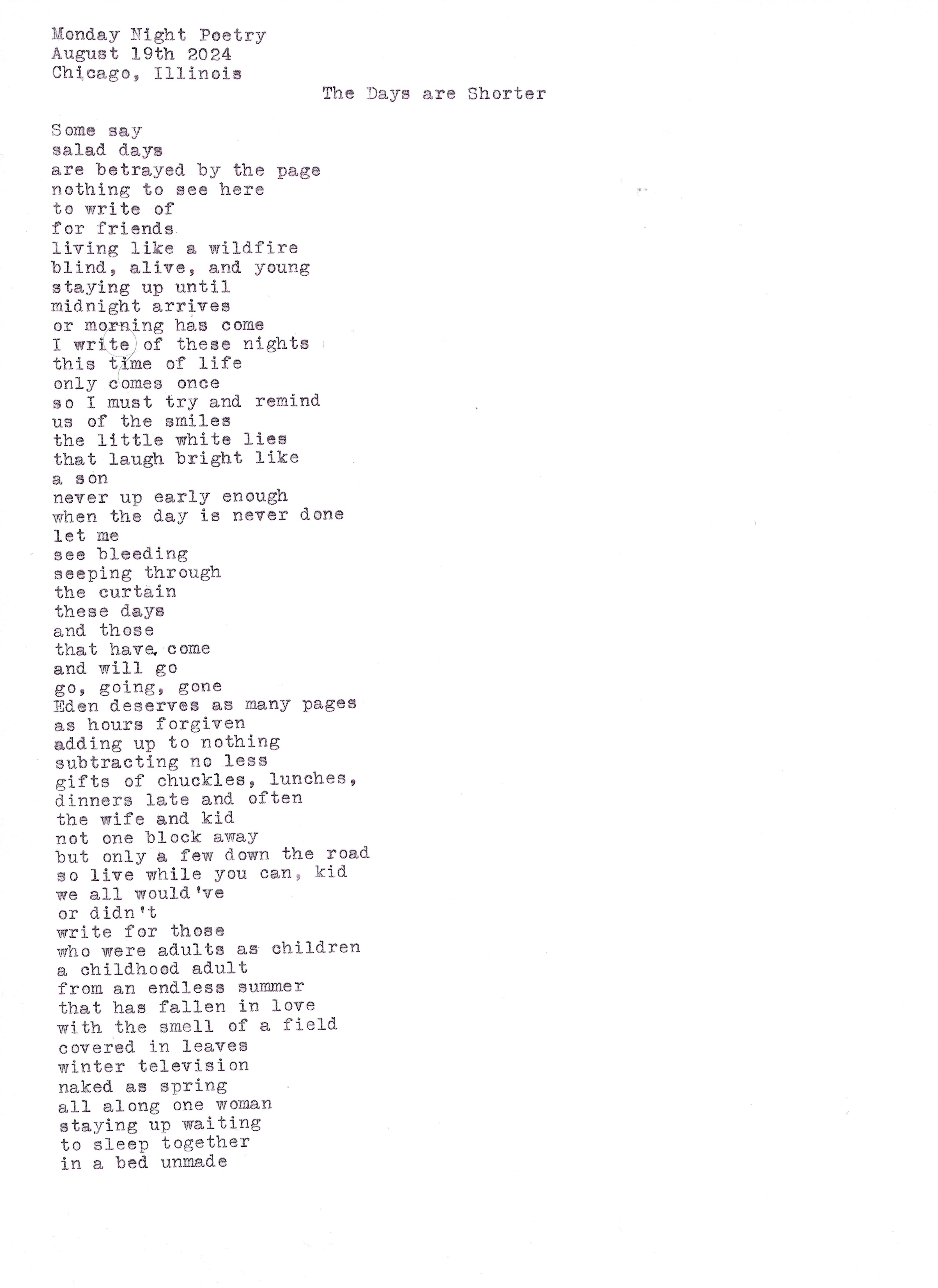 The Days are Shorter – Monday Night Poetry 8/19/24