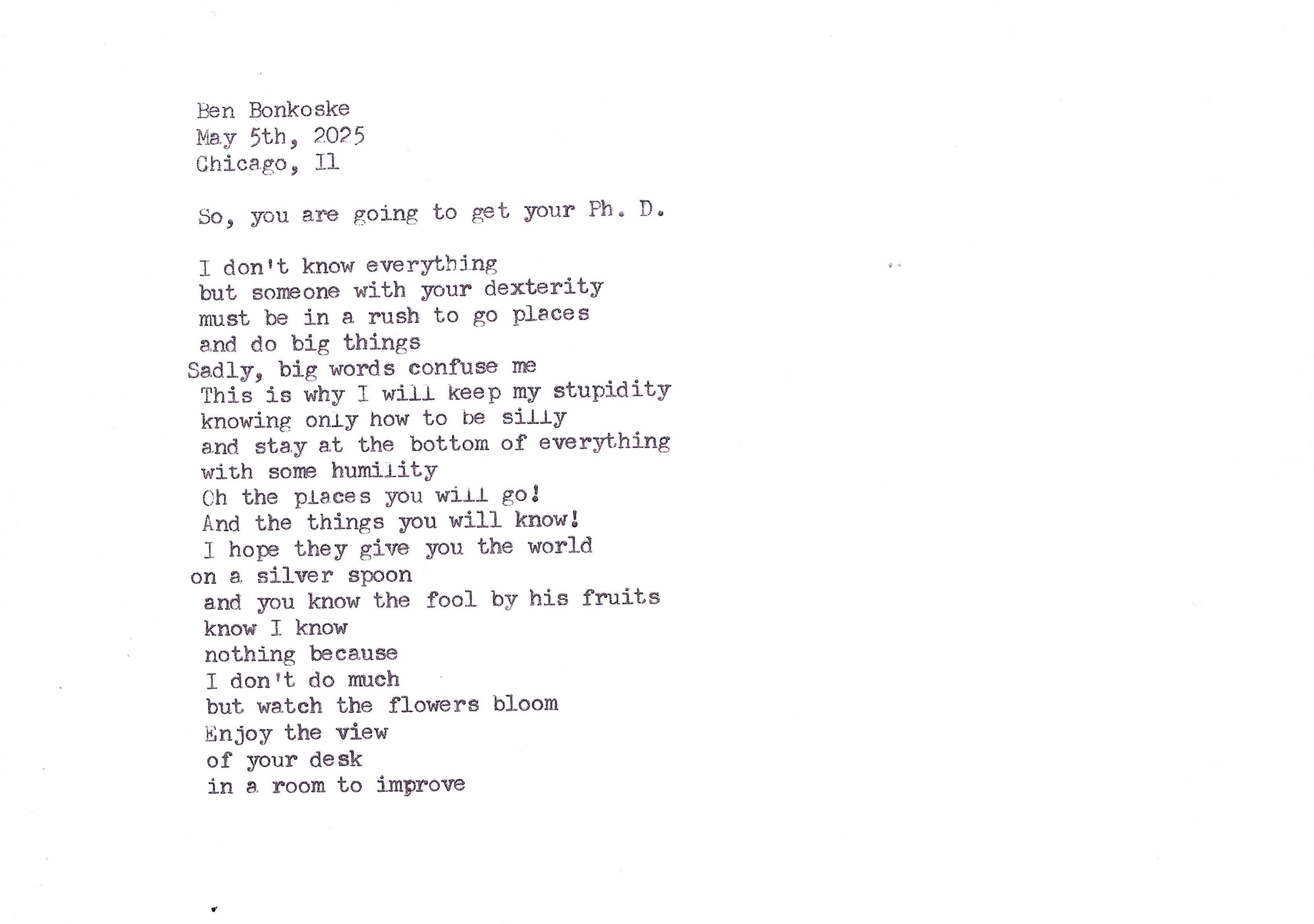 Ben Bonkoske is the author of two novels, Spoon in the Road, and Carolina, Colorado, California. He is also the author of two collections of short stories, Ten Zen by Ben, and Eleven Stories for 11:11. He wrote his own major at the University of North Carolina, Asheville focusing on Racial Tension in America. He attended Northeastern, Illinois University where he earned a Masters of Arts in Secondary Education. He lives in Chicago, where he likes to take walks.