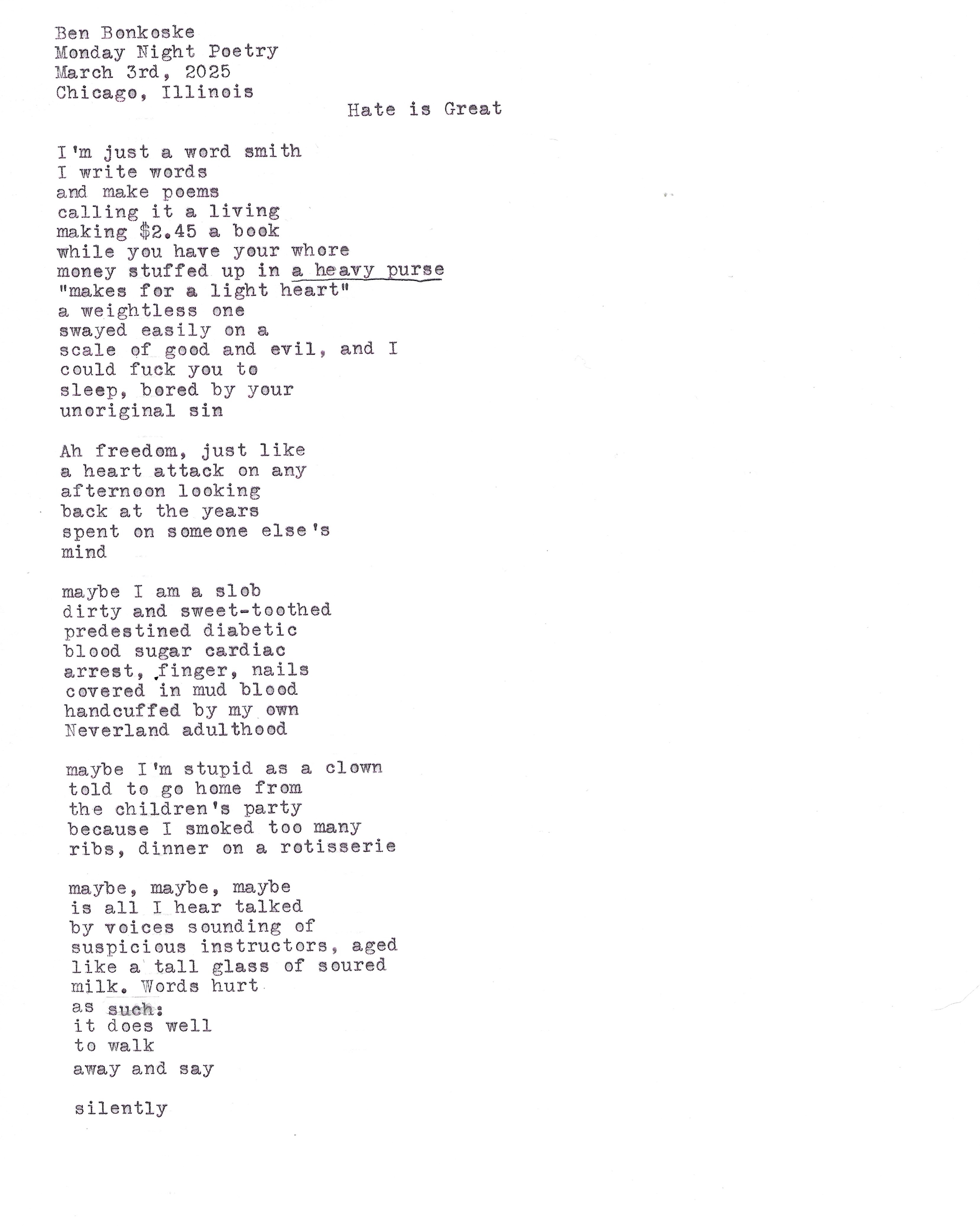 Ben Bonkoske is the author of two novels, Spoon in the Road, and Carolina, Colorado, California. He is also the author of two collections of short stories, Ten Zen by Ben, and Eleven Stories for 11:11. He wrote his own major at the University of North Carolina, Asheville focusing on Racial Tension in America. He attended Northeastern, Illinois University where he earned a Masters of Arts in Secondary Education. He lives in Chicago, where he likes to take walks.