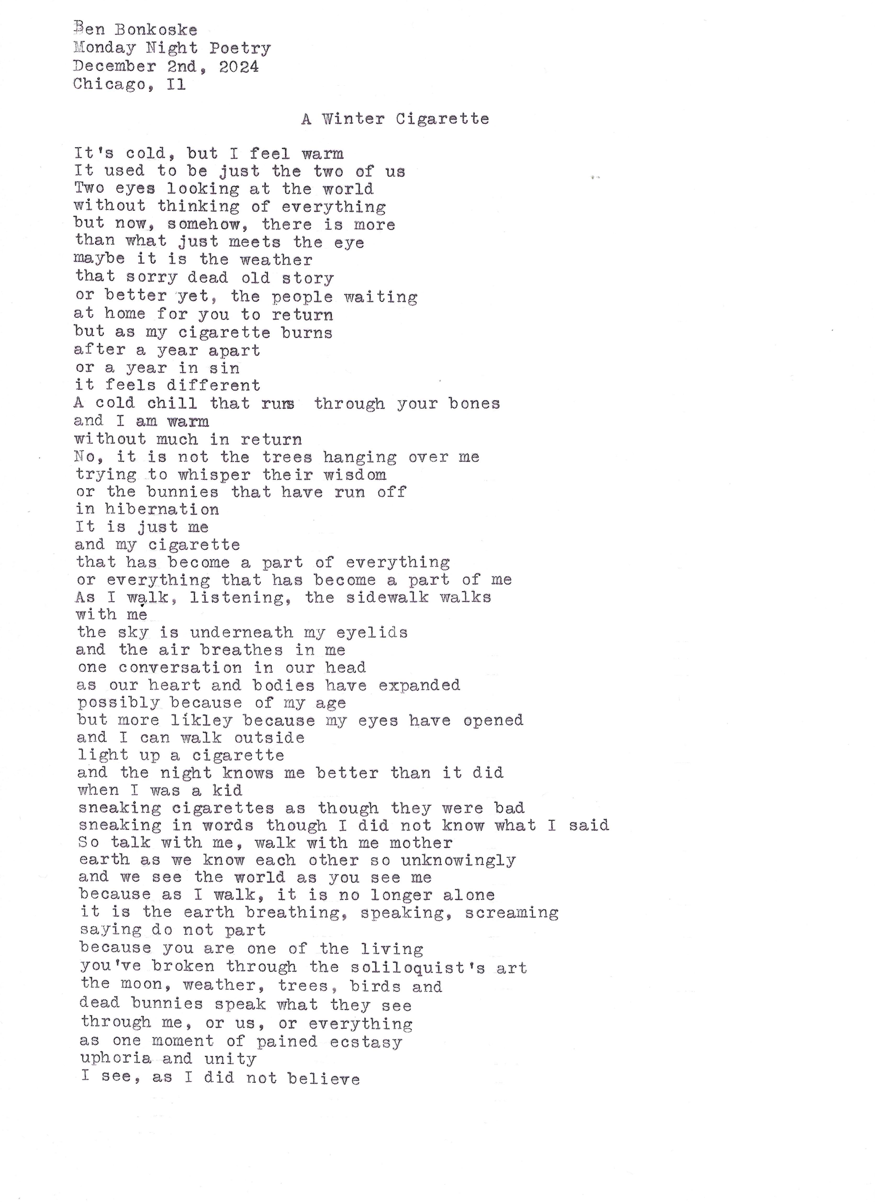 Ben Bonkoske is the author of two novels, Spoon in the Road, and Carolina, Colorado, California. He is also the author of two collections of short stories, Ten Zen by Ben, and Eleven Stories for 11:11. He wrote his own major at the University of North Carolina, Asheville focusing on Racial Tension in America. He attended Northeastern, Illinois University where he earned a Masters of Arts in Secondary Education. He lives in Chicago, where he likes to take walks.