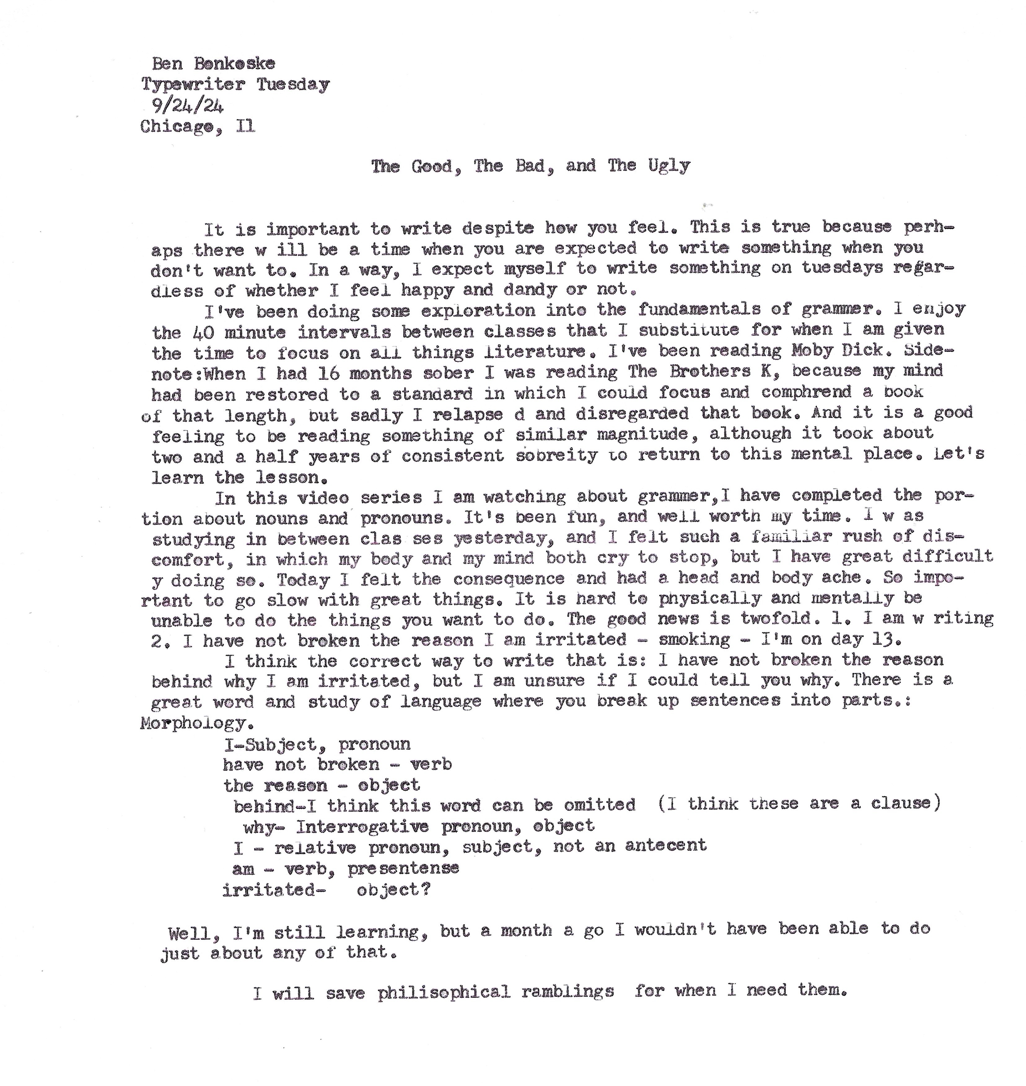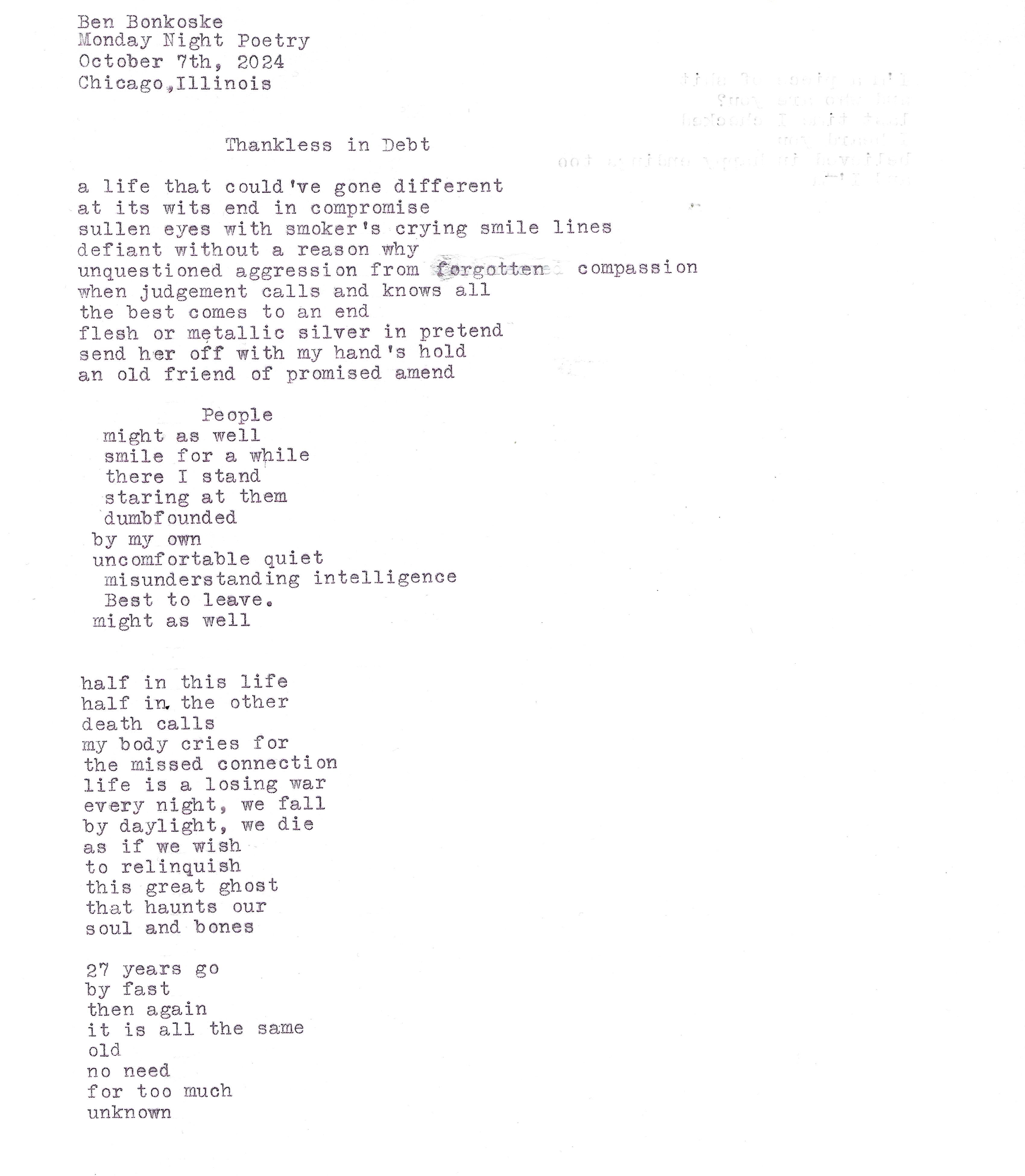 Ben Bonkoske is the author of two novels, Spoon in the Road, and Carolina, Colorado, California. He is also the author of two collections of short stories, Ten Zen by Ben, and Eleven Stories for 11:11. He wrote his own major at the University of North Carolina, Asheville focusing on Racial Tension in America. He attended Northeastern, Illinois University where he earned a Masters of Arts in Secondary Education. He lives in Chicago, where he likes to take walks.